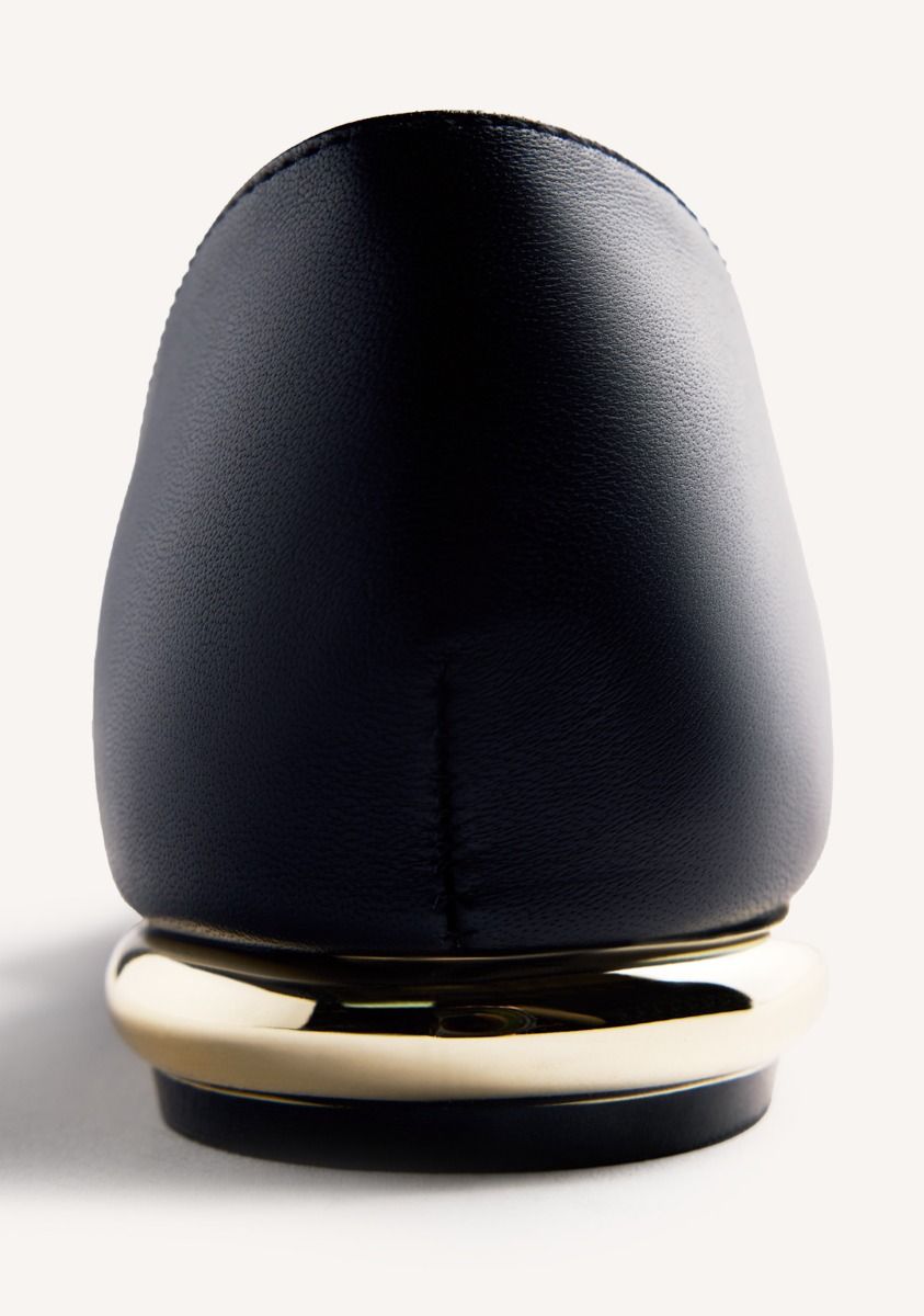 Bailarinas de piel con ollados en acabado dorado y tacón metalizado. Punta afilada. Cuentan con planta acolchada y tira en el empeine. Altura tacón: 1,5 cm.
