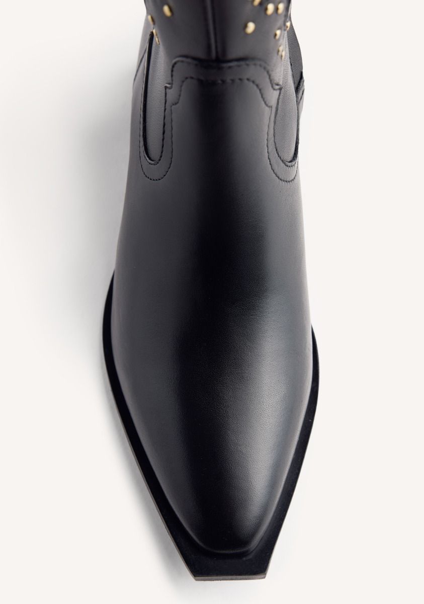 Botas de piel estilo cowboy con calado y tachas en acabado dorado. Caña media, punta ovalada y tacón cubano. Cuentan con plantilla acolchada y cremallera en el lateral interno de la caña. Altura tacón: 4 cm. Altura caña: 21 cm. Seguimos la guía estándar de anchos de caña, ajustando la medida según la talla. El número 37 se adapta a gemelos con un perímetro de hasta 38 cm.