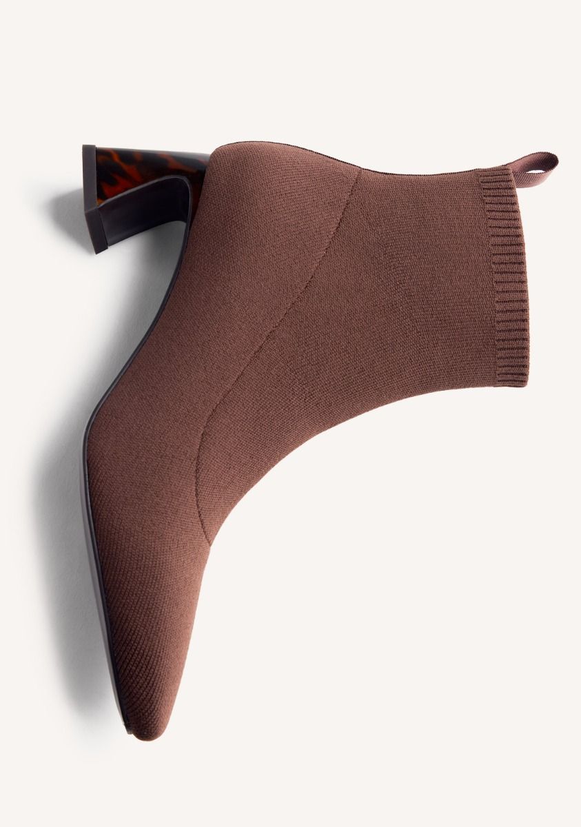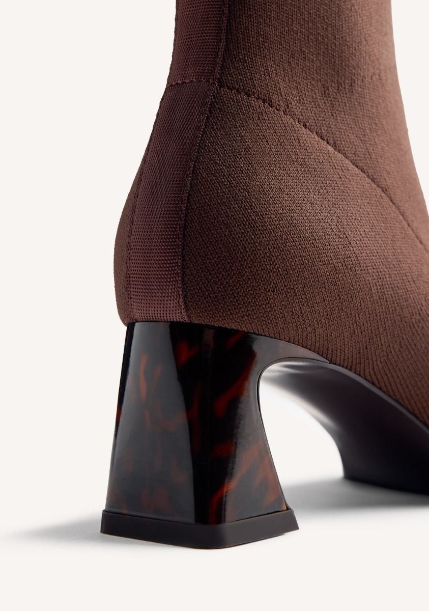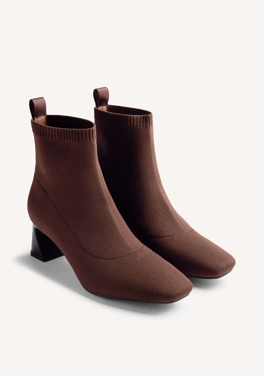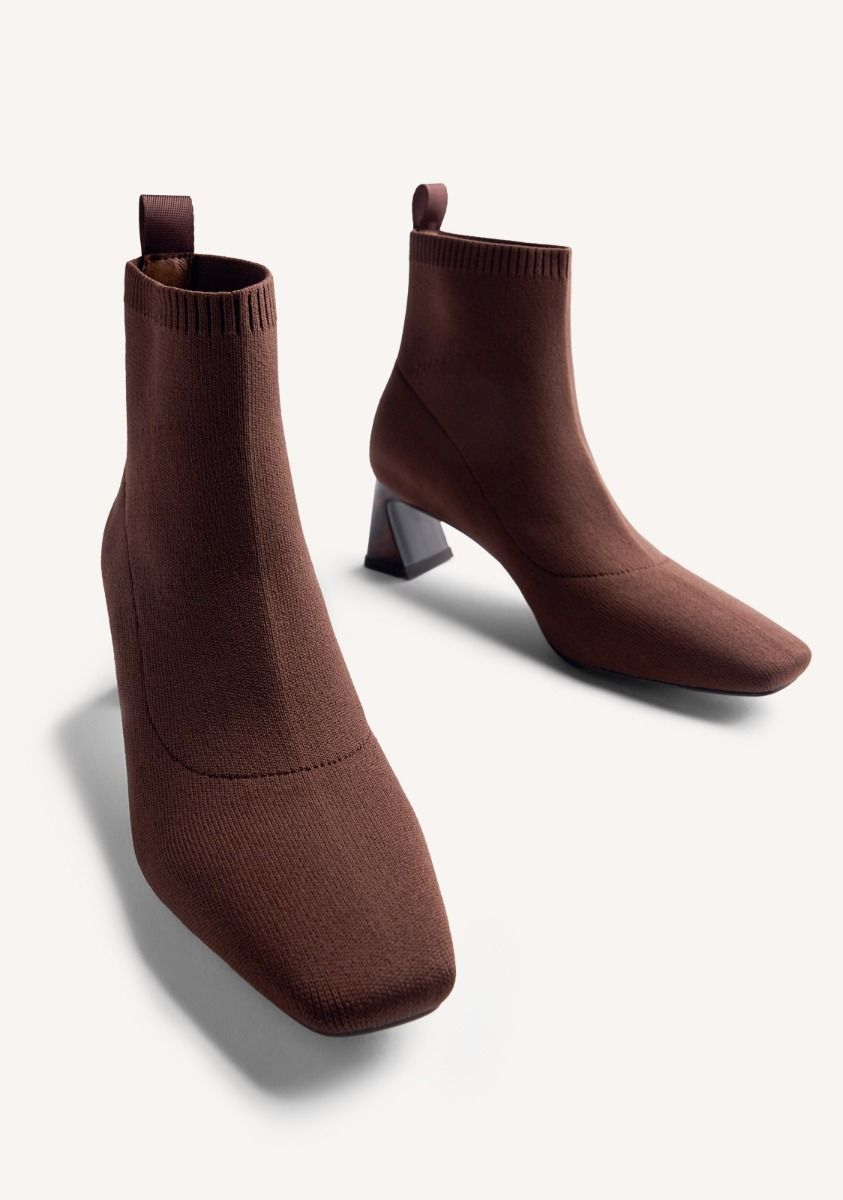 Botines con caña tipo calcetín. Tacón escultórico efecto carey y punta cuadrada. Cuentan con plantilla acolchada. Este modelo destaca por su suavidad y elasticidad. Altura tacón: 5,5 cm. Seguimos la guía estándar de anchos de caña, ajustando la medida según la talla.