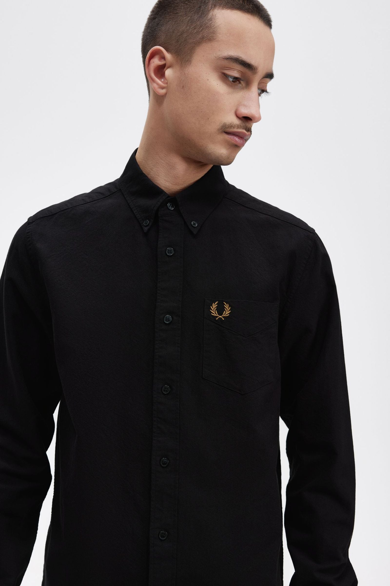 Algodón Oxford / Corte recto / Cuello con botones / Bolsillo en el pecho / Logotipo de la corona de laurel bordado en el lado izquierdo del pecho