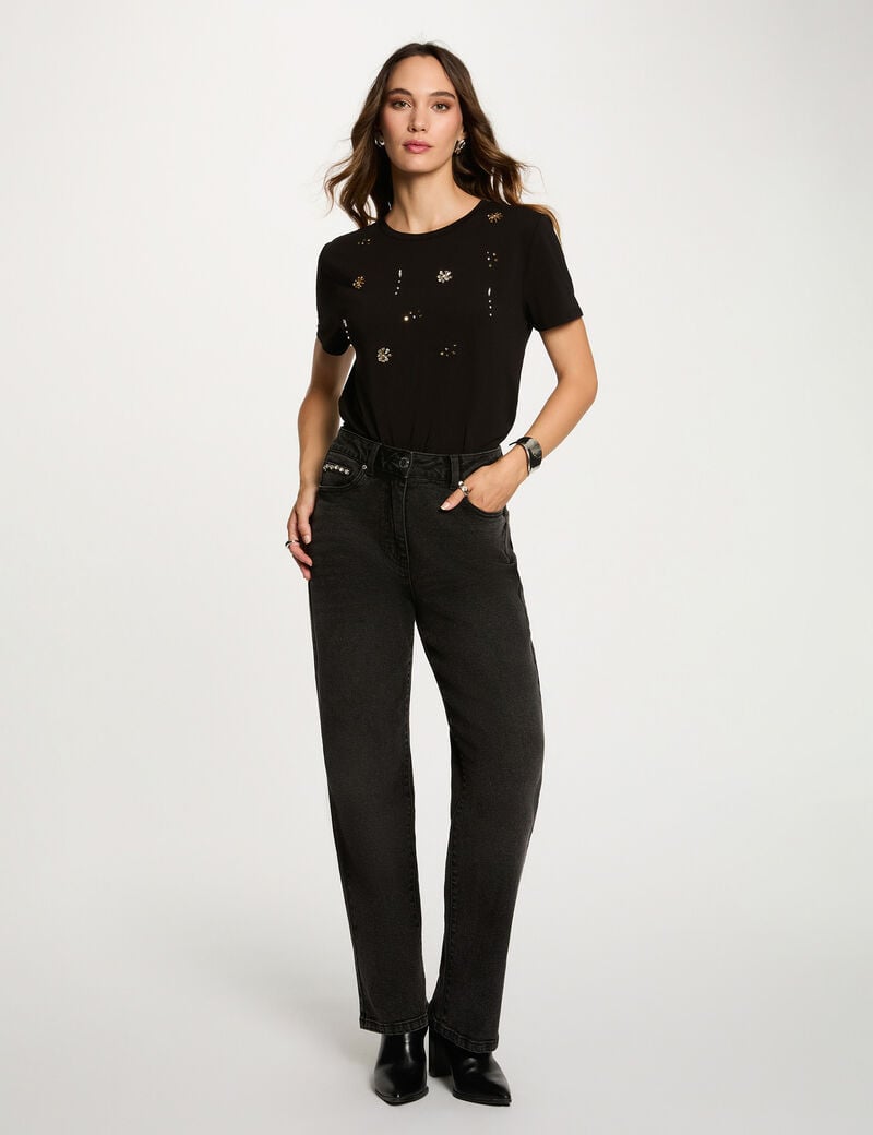- Esta camiseta de corte recto se adapta armoniosamente a todas las siluetas. Su cuello redondo resalta el cuello con una elegancia sutil, perfecta para un estilo femenino y moderno.