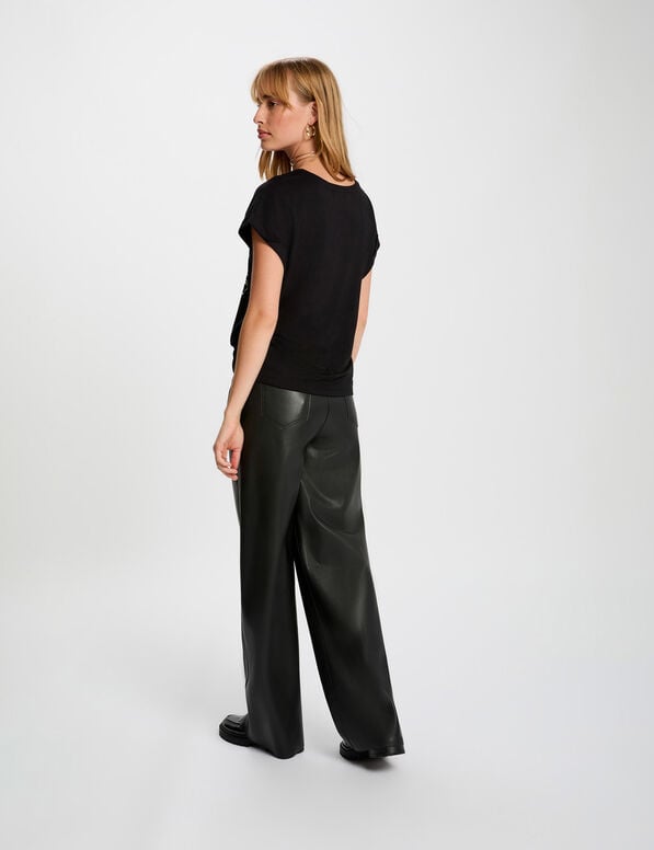 - La camiseta se combina con un pantalón amplio y estructurado, acompañado de zapatos planos para un estilo chic y desenfadado.
