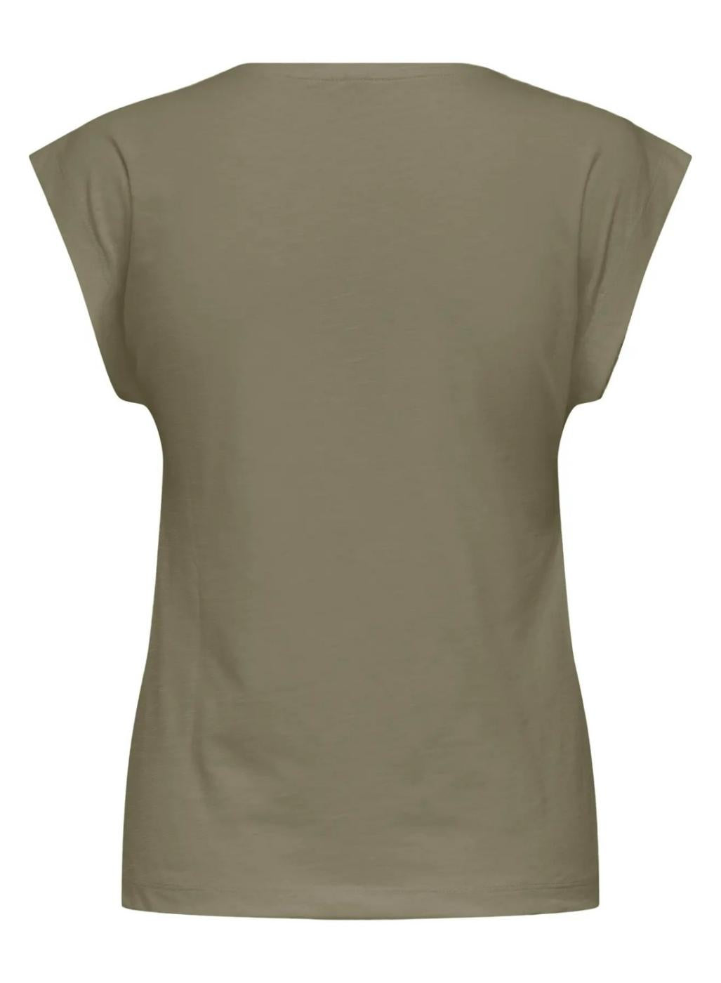 Camiseta Only. Modelo Delia. Color marrón. Cuello redondo. Manga extracorta. Ajuste ligeramente entallado. Aplicación bordada estilo canesú en el pecho.