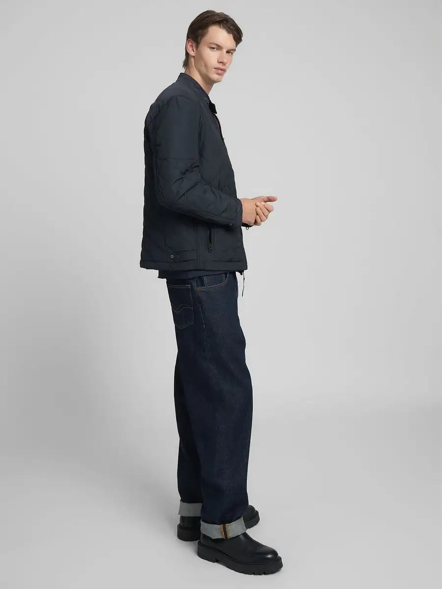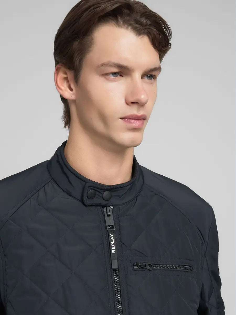 Cazadora con cremallera completa en tejido técnico acolchado y pespunteado de corte regular. Tiene reguladores de cierre en la parte inferior de la prenda, cuello subido con cierre de doble botón y puños abotonados y con cremallera. La prenda presenta dos bolsillos con cremallera en los laterales y un bolsillo con cremallera en el pecho. El diseño se completa con el tirador de la cremallera con el logotipo y el logotipo del rombo en la manga, una expresión del ADN de Replay.