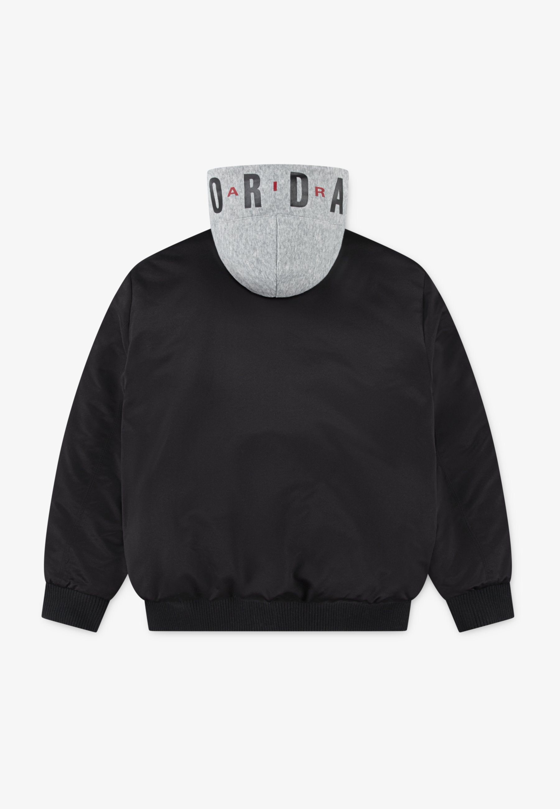 Chaqueta negra JORDAN JDN BIG LOGO para niño y niña. Una prenda deportiva y contemporánea, perfecta para completar looks urbanos. La chaqueta está confeccionada en tejido resistente, con cremallera completa y detalles icónicos de Jordan. La capucha de forro polar es gris con estampado JORDAN en negro y rojo. Se recomienda lavar a temperatura media. Temporada otoño/invierno.