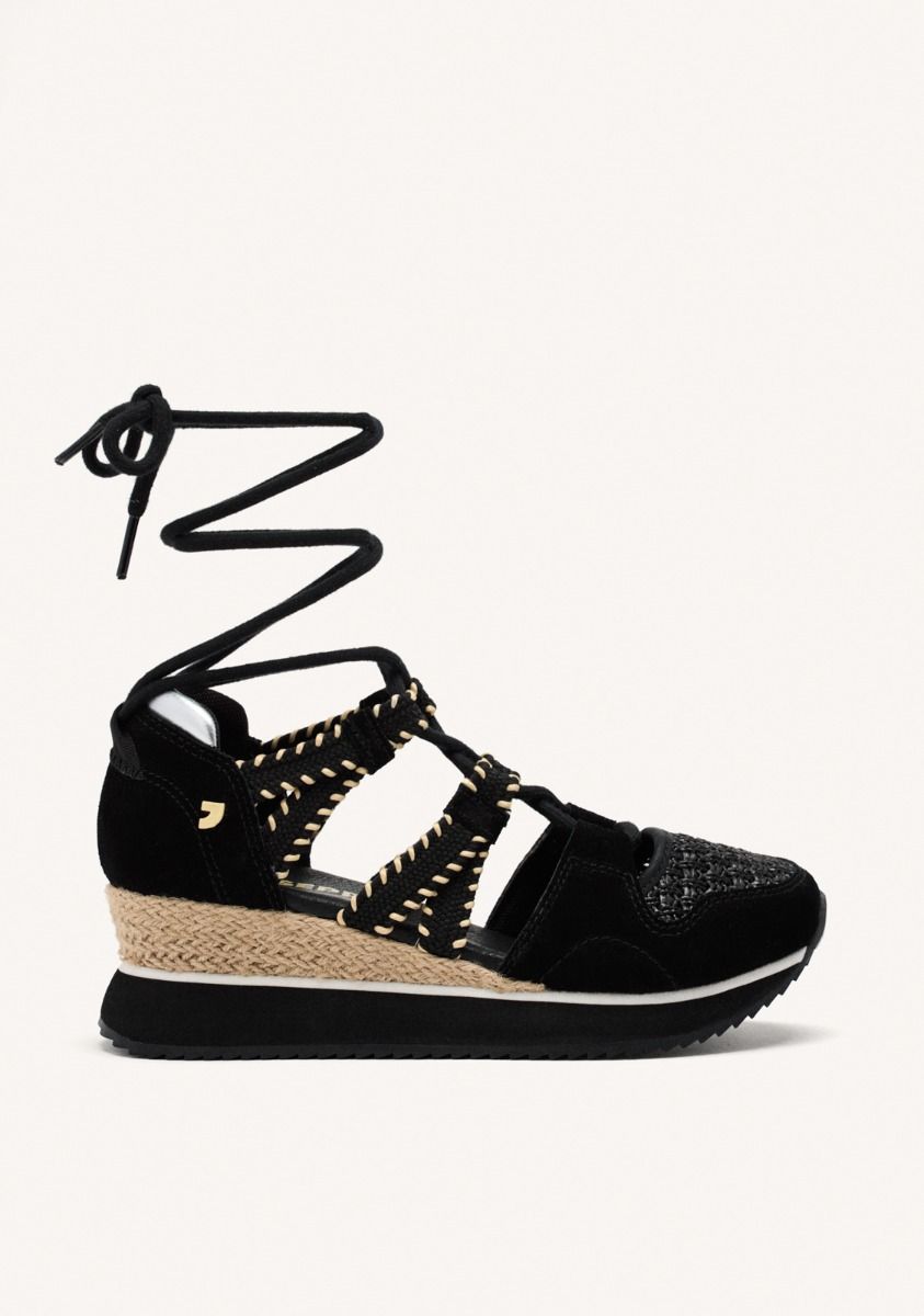 Sandalias deportivas de piel con cuña de rafia. Cuentan con planta acolchada. Atadas con tiras. Altura cuña: 5,5 cm.