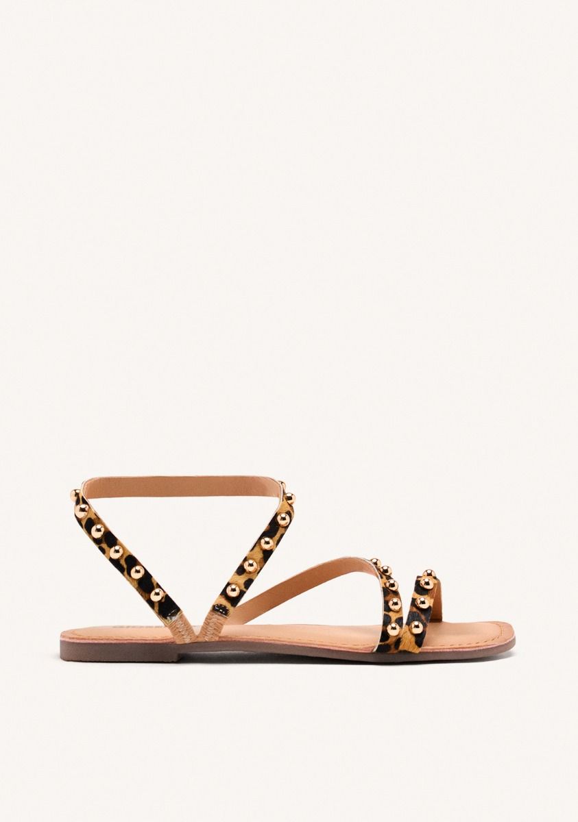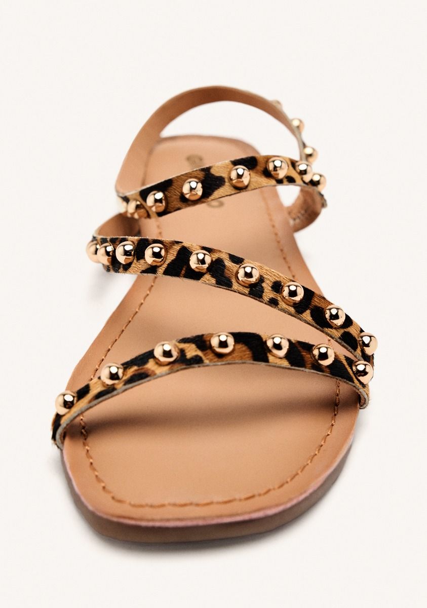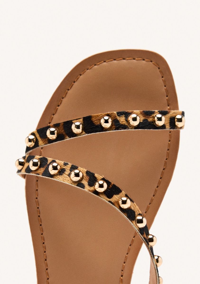 Sandalias planas de piel con estampado animal y adorno de tachas. Cuentan con planta acolchada de piel.