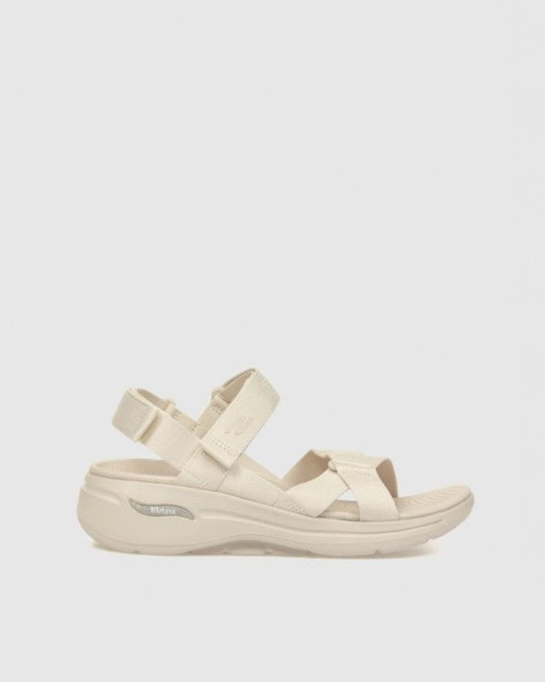 Sandalias chancletas de mujer de color beige de la marca Skechers. El material usado en su fabricación es varios materiales . El tacón de este par de sandalias es plataforma.