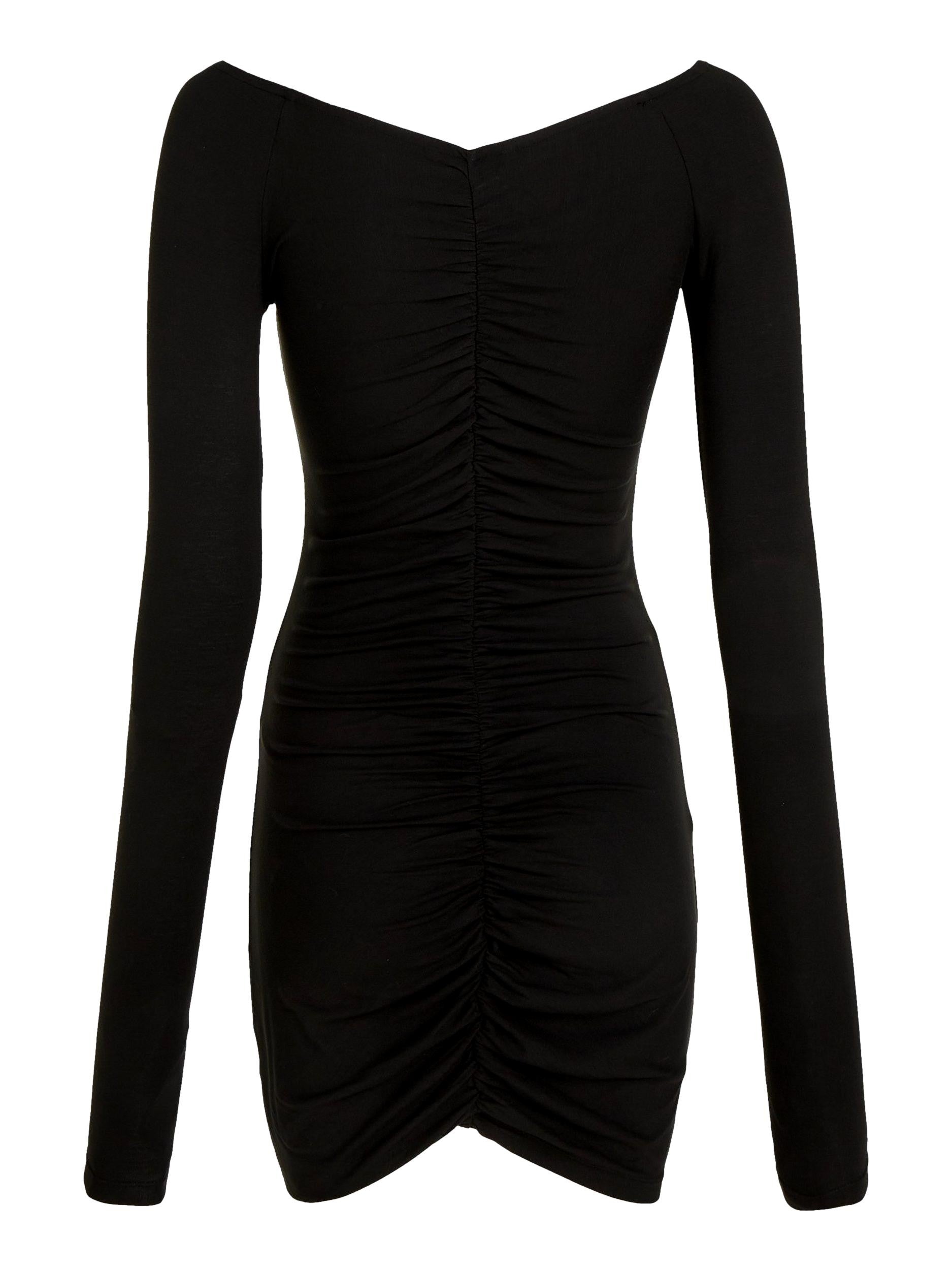 Luce una figura elegante en la pista de baile con este vestido ajustado, con favorecedores detalles fruncidos y un glamuroso escote con hombros descubiertos.