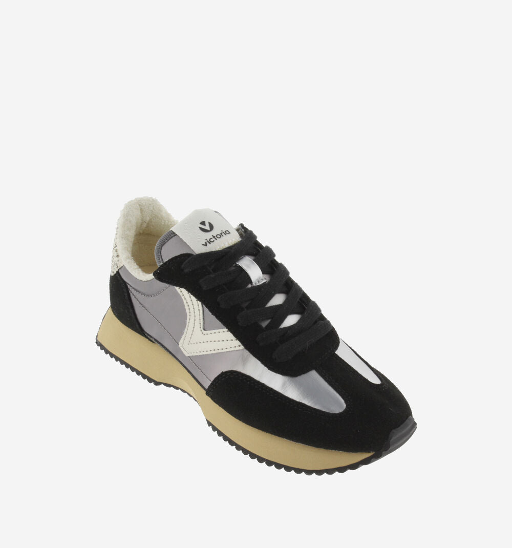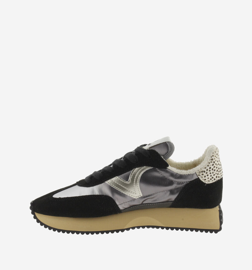 Sneakers para mujer confeccionadas en nylon con piezas de serraje y detalles metalizados y en animal print. Cierre mediante cordones al tono. Interior de rizo. La suela tostada y el patín dentado en negro añaden un toque dinámico y desenfadado. Además, incluyen plantilla extraíble para mayor comodidad y versatilidad.