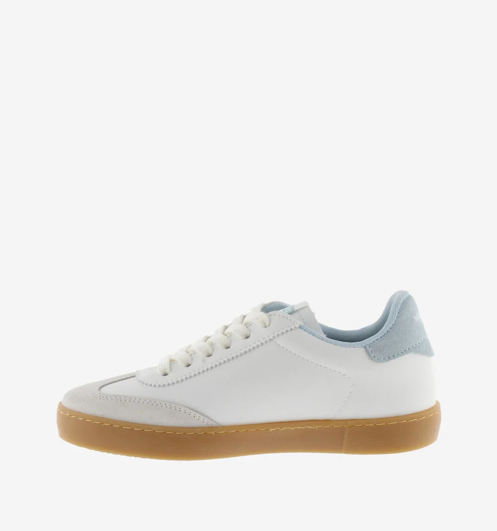 Zapatillas blancas para mujer fabricadas en material efecto piel y piezas de serraje. Detalles color pastel al tono en la V del lateral y la trasera. Suela traslúcida color caramelo aportando un toque de estilo retro. Además, incluyen una plantilla más ergonómica, confeccionada a partir de materiales reciclados, proporcionando un confort superior en cada paso.