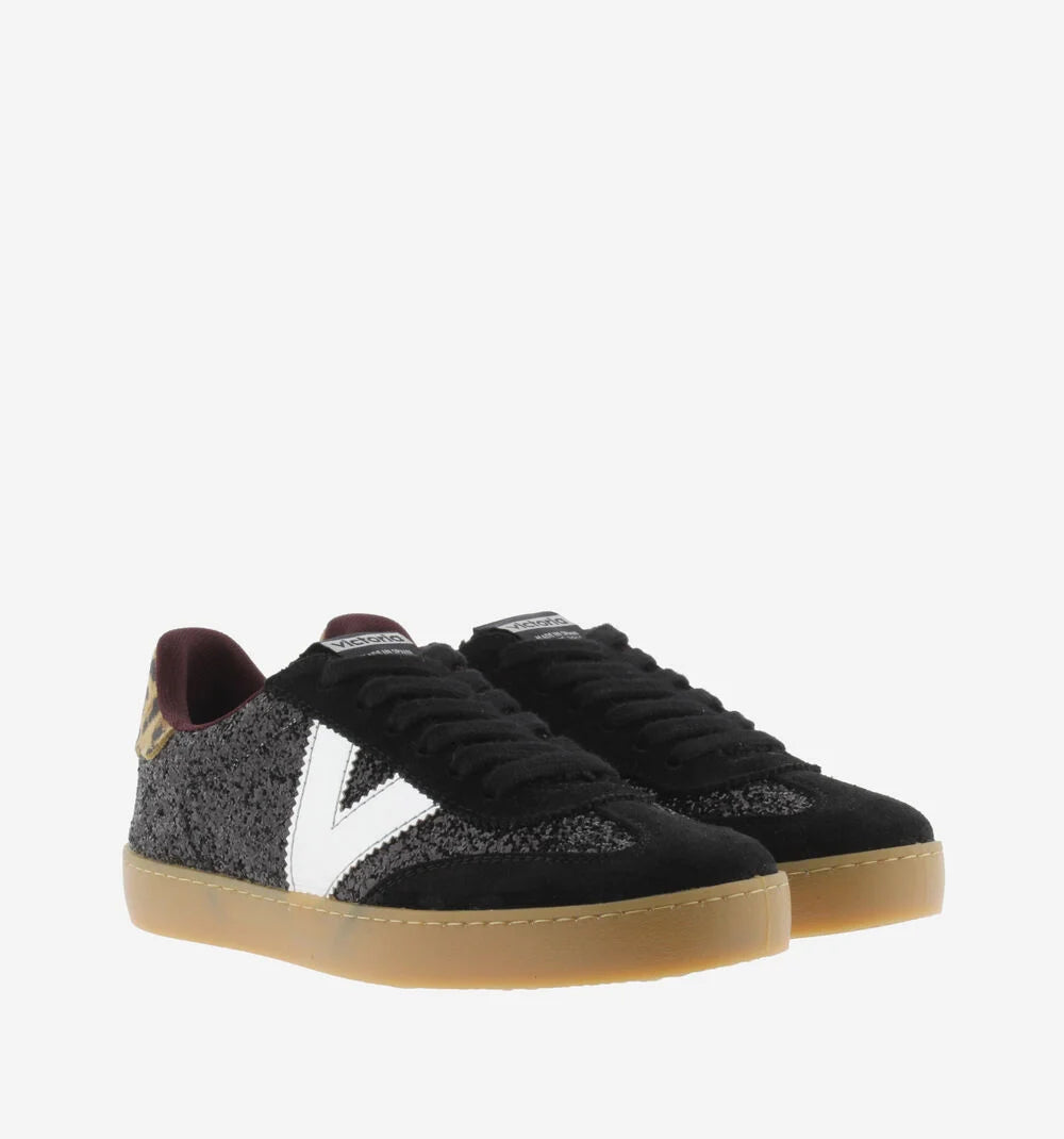 Zapatillas para mujer fabricadas en España en glitter con textura y piezas de serraje. V del lateral metalizada y detalle animal print en pieza trasera (en color negro). En color plata, ambas piezas se presentan en serraje craquelado. Cierre mediante cordones gruesos al tono (en color negro) y en animal print (en color plata) y nuevo corte ciclista en la puntera. Detalle también de borreguito en lengüeta en este último color. Su suela traslúcida color caramelo aporta un toque de estilo retro. Además, incluyen una plantilla más ergonómica, confeccionada a partir de materiales reciclados, proporcionando un confort superior en cada paso.